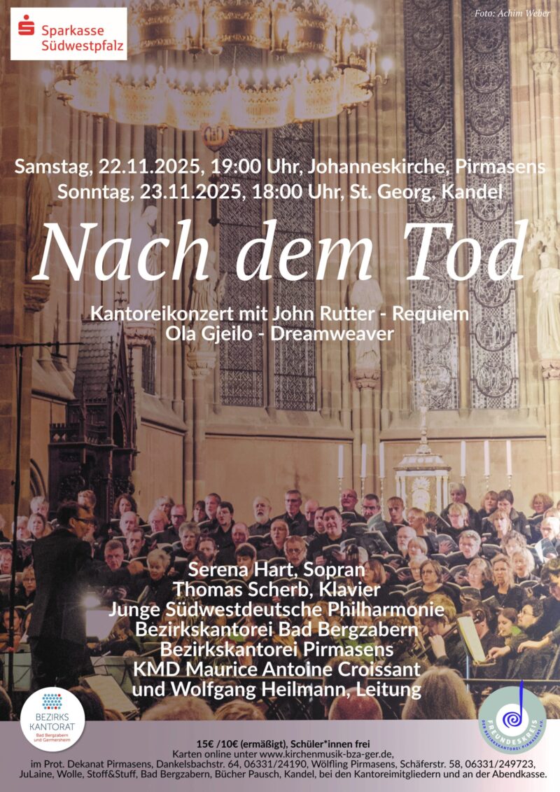 Die beiden Bezirkskantoreien aus Pirmasens und Bad Bergzabern unter der Leitung der Bezirkskantoren KMD Maurice Antoine Croissant und Wolfgang Heilmann wirken nach den umjubelten „Friedensmesse“-Konzerten ein weiteres Mal zusammen. Unter der Überschrift „Nach dem Tod“ kommt John Rutters Requiem verwoben mit Ola Gjeilos Dreamweaver zur Aufführung. So kommen gut 100 Sängerinnen und Sänger zusammen, die …
